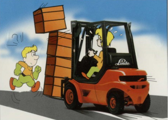 不允許任何人站在或經(jīng)過(guò)提升起的貨叉下,也不允許直接站在叉車后部或在叉車轉(zhuǎn)彎時(shí)位于后部回旋區(qū)內(nèi)。